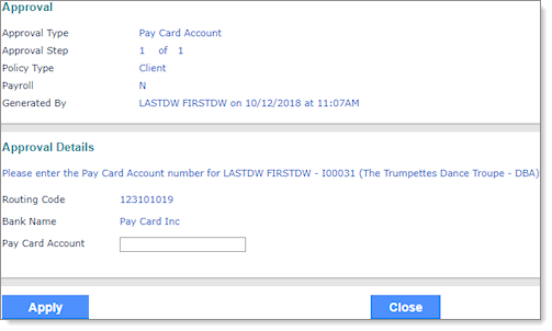 After users create their direct deposit pay card account, the system creates an approval and assigns it to designated approvers in PrismHR. The approval is used to assign the pay card account number. Use the Approvals Pending form to select a pending pay card account approval.