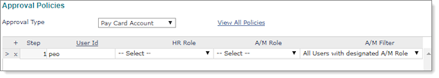 3. | In HR Role or A/M Role, select a User ID, and permit them as a Pay Card Account Approver. For more information about user role types, see User Roles in the System Administration User Guide. |