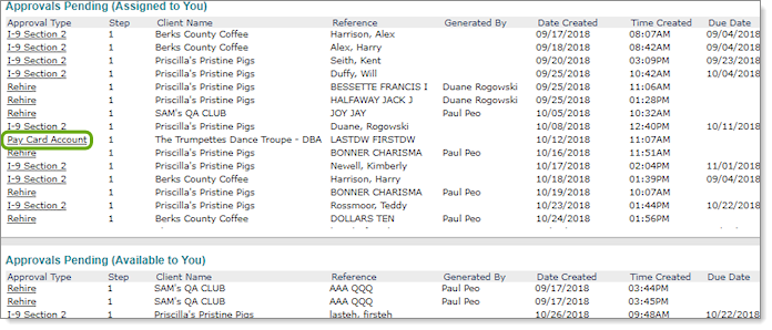 To select a pay card account approval, use the Approvals Pending (Assigned to You) panel. The approval is used to assign the pay card account number.