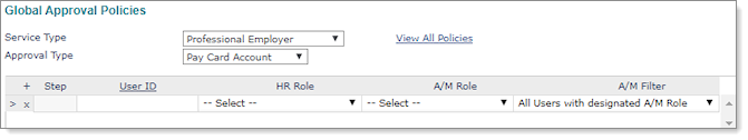 Pay card approval policies can be set up at the system level using the Global Approval Policies form or the client level using the Approval Policies form.