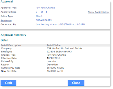 2. | To move the approval to the Approvals Pending (Assigned to You) panel, click Grab. |