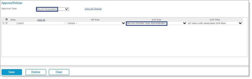 | • | After clicking Yes, the Approval Policies form displays. Configure a Payroll Approver for the Payroll Approval (Multistep) approval type. For example: |