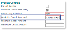 | • | Control tab on the Client Details form: Select Standard in the Worksite Payroll Approval field for a worksite manager or worksite trusted advisor. For example: |