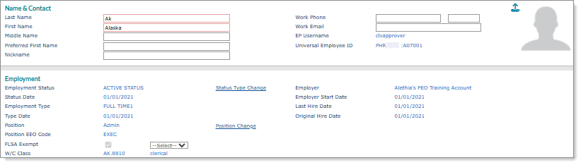 You can define employee name and contact information, as well as related read-only employment information using the Name tab on the Employee Details form. For example: