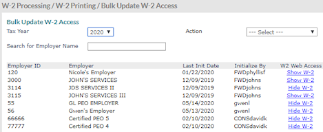 Set employee access to electronic W-2 forms for multiple employers using the Bulk Update W-2 Access form. You must initialize the W-2s before you can provide access.