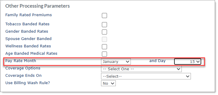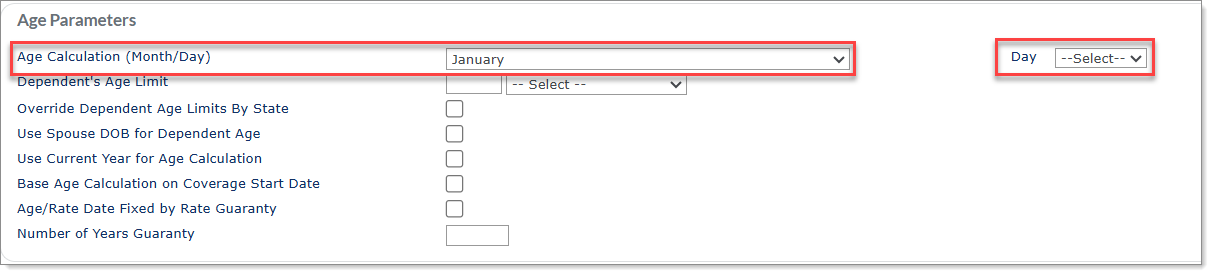 When you select a Benefit Plan, then under the Age Parameters section, for the Age Calculation (Month/Day) field, the Day field is now a drop-down field and is conditionally displayed only when a valid Month (January-December) is selected. |