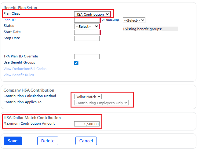 When you select HSA Contribution in the Plan Class field on the Benefit Plan Setup form, then the Use Benefit Groups field is enabled. Additionally, under the Company HSA Contribution section a new drop-down option named Dollar Match has been added to the Contribution Calculation Method field. When you select the Dollar Match drop-down option, the Contribution Applies To fields defaults to a read-only Contributing Employees Only option. Additionally, the conditional section displays with the header name HSA Dollar Match Contribution with a Maximum Contribution Amount field that you can edit. |