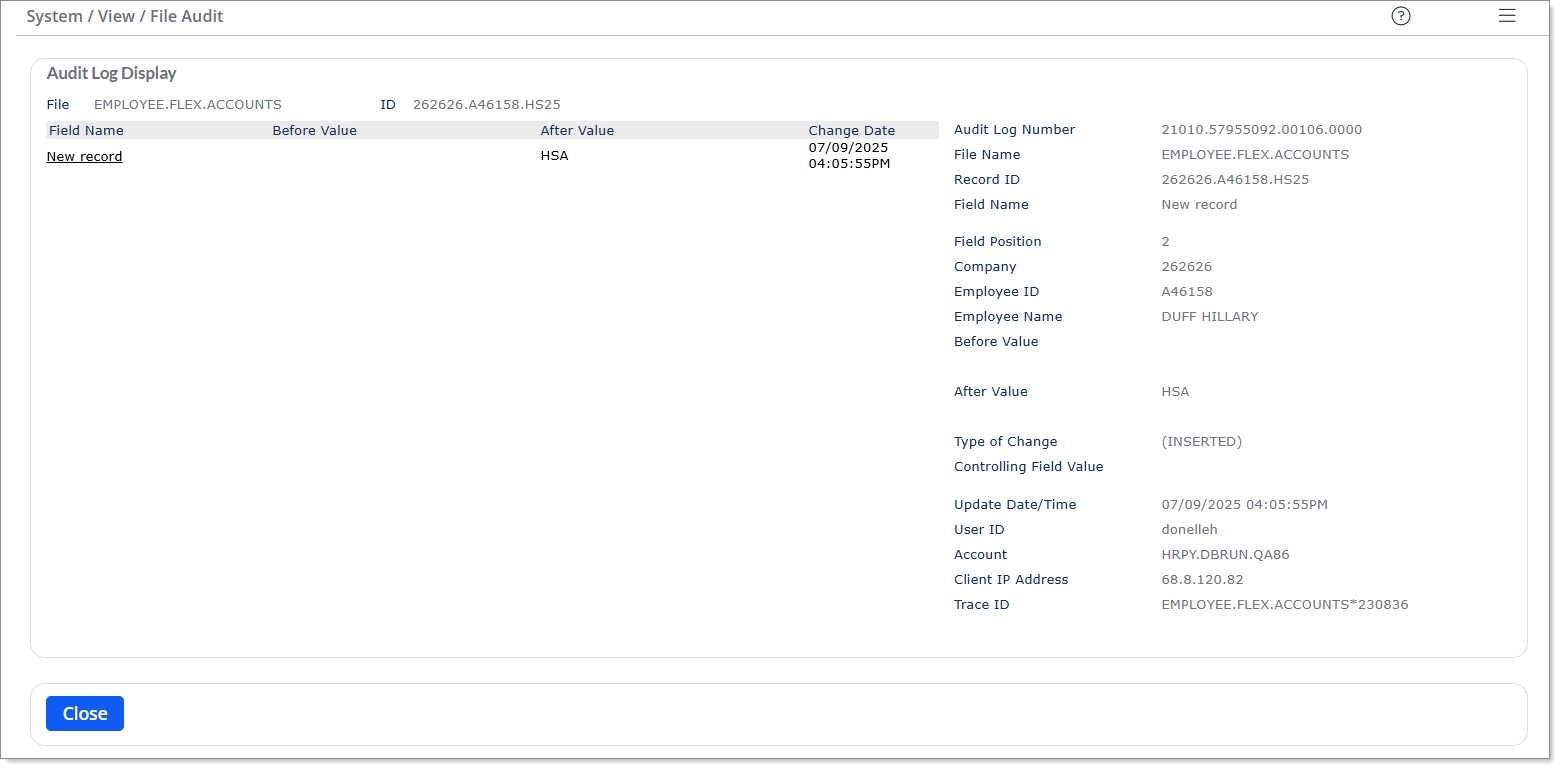 On the Benefit Plan Setup form, when you set an HSA benefit plan with Company HSA Contribution setup for All HDHP Employees and the Employee is enrolled in an HDHP medical plan, then on the Employee Flexible Spending Accounts form, when you click Audit under the Actions menu, new Flex Spending Account record is created and is also tracked in the audit log. |