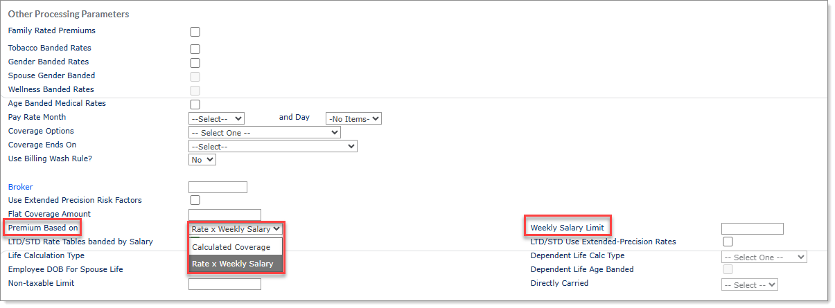 When you select a Benefit Plan, then under the Other Processing Parameters section, the Pay Rate Month and Day field has now become an optional field. However, if you enter any value for the Month field, then the Day field becomes mandatory. Under the Other Processing Parameters section, the earlier LTD/STD Based on Salary Instead of Coverage Amount field has been renamed to Premium Based on and is now a drop-down field. Additionally, the conditional field LTD/STD Salary Limit has also been renamed to Weekly Salary Limit/Monthly Salary Limit. Note: Please note the following: If you select a benefit plan with Offer Type as Short Term Disability (STD), then the options in the Premium Based on drop-down field are: