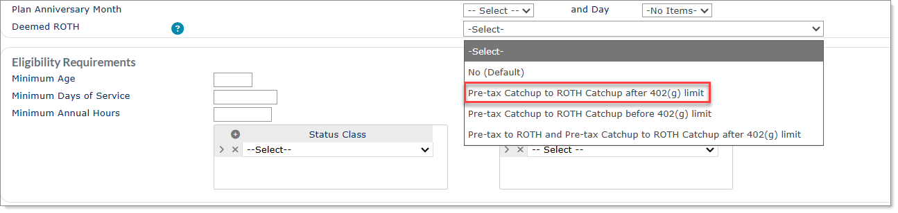 | WSP-2874 | Functionality of Pre-tax Catchup to ROTH Catchup after 402(g) limit option for Deemed ROTH field |