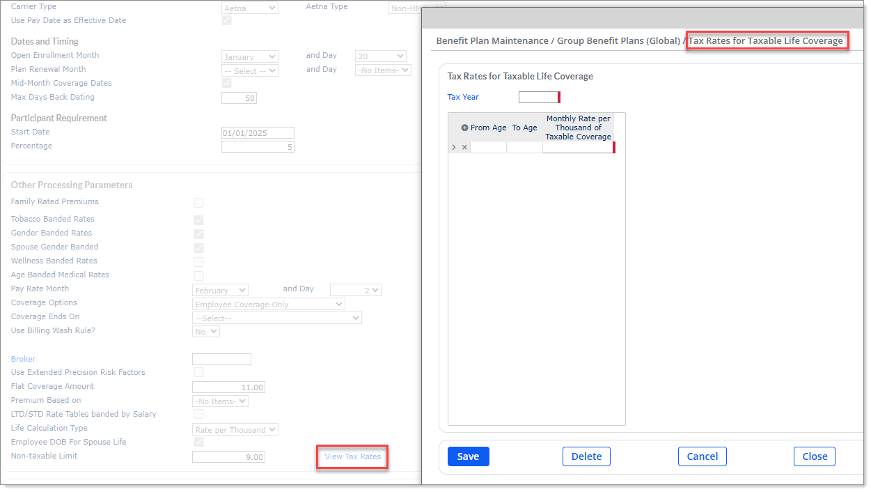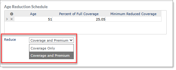 When you select a benefit plan with Offer Type as Life Insurance, then under the Other Processing Parameters section, a new hyperlink named View Tax Rates is added next to the Non-taxable Limit field, which redirects you to Tax Rates for Taxable Life Coverage modal form. After you select a benefit plan with Offer Type as Life Insurance, then under the Age Reduction Schedule, the earlier Reduce coverage and premium checkbox field has been renamed to Reduce and is now a drop-down field with the following options: