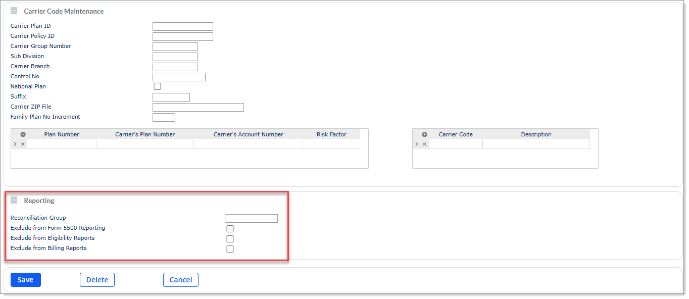 On the Group Benefit Plans form, the fields related to reporting from different sections have been moved to the newly created Reporting section which is now available below the Carrier Code Maintenance section. This section displays for all insurance class plans. |