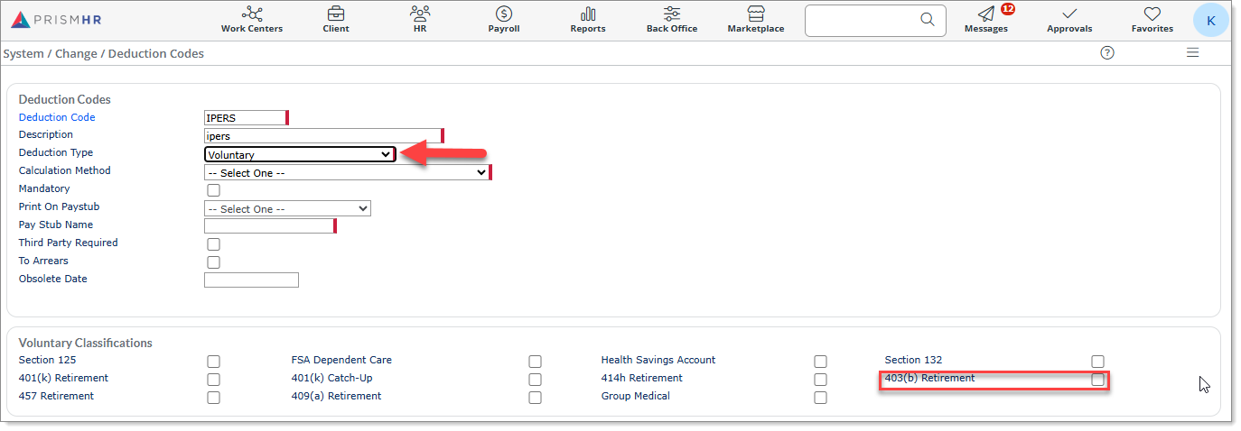 On this form, when you select the Deduction Type field as Voluntary, then under the Voluntary Classifications section, a new field named 403(b) Retirement appears as you can see from the screenshot below: Now, you have a voluntary deduction type to support a 403(b) tax-sheltered annuity plan. The deduction amount will be exempt from Federal Withholding and resident State Withholding. |