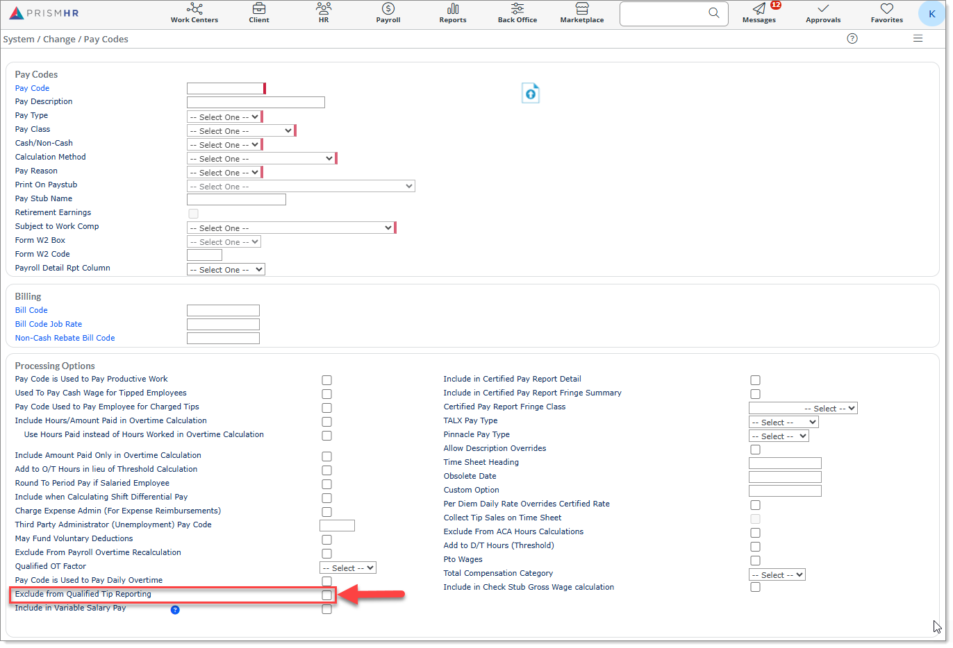 On this form, under the Processing Options section, a new field named Exclude from Qualified Tip Reporting has been added as you see from the screenshot below: This field is unchecked by default. Check this field if you want to exclude the pay code from Qualified Tip Reporting. This field has no functionality within payroll processing, but it will be used in future recalculation and reporting options related to OBBBA. |