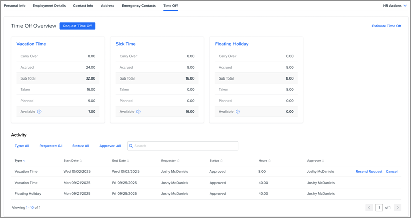 The Time Off tab has undergone a redesign for both the employee's My Time Off form and the manager's My Employees Time Off tab. The employee My Time Off tab now features an Overview tab, as well as separate tabs to view the details for each PTO plan. Current PTO requests display on the Planned tab, while past requests display on the History tab. Employees can submit PTO requests using the Request Time Off button. This button now displays a separate window, where all the PTO information can be added directly and easily. In addition, they can use the Estimate Time Off link to access a tool to estimate the amount of PTO they will have at another time. This design now matches the Time Off tab on the manager's My Employees form. Managers can use this form to review and send PTO requests for their employees. |