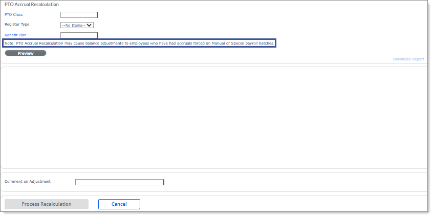 When users enrolled an employee in a PTO Benefit Plan in the PTO Benefit Plans form with a calculation basis of Hours Worked (by Hours) or Hours Worked (by Months), a message displayed even when there was a value for Max per Year, “Warning: no additional hours will be accrued because the initial amount is equal to the maximum accrual of 0.00 hours set up in the PTO benefit plan.” |