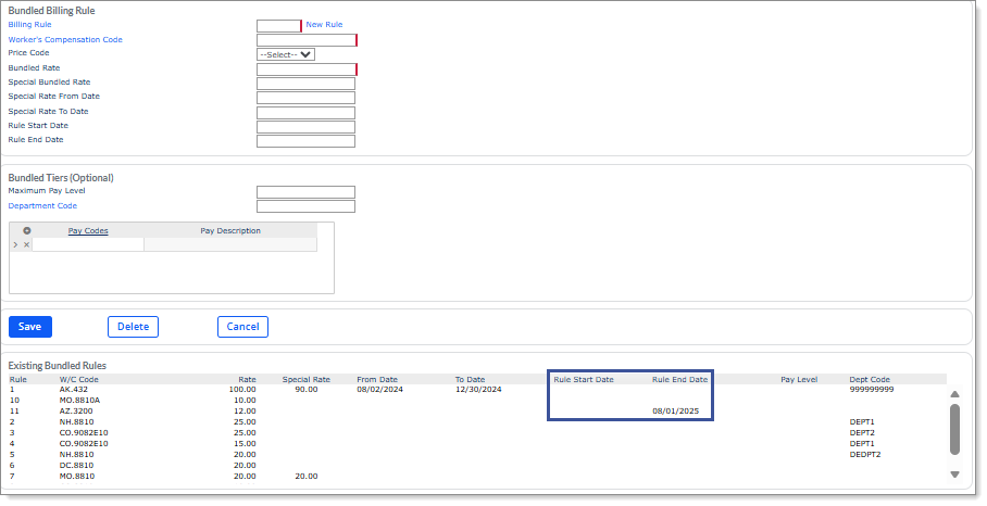 When users selected the Tiered Per Employee Per Pay Period option as the Unbundled Billing rule basis in the Billing Rules (Unbundled) form, the system did not count employees with a status classification of Active in the employee count to determine the Tier Level rate per employee. |