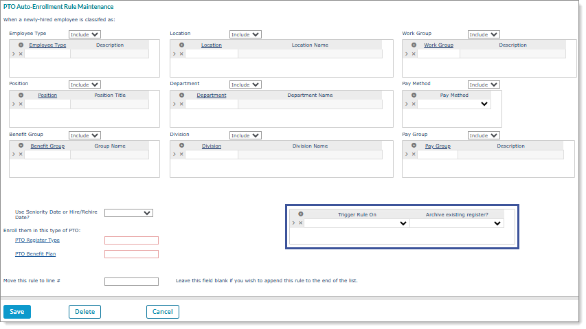 In this scenario, clicking New Rule now opens the PTO Auto-Enrollment Rules Maintenance form, which displays blank fields. |
